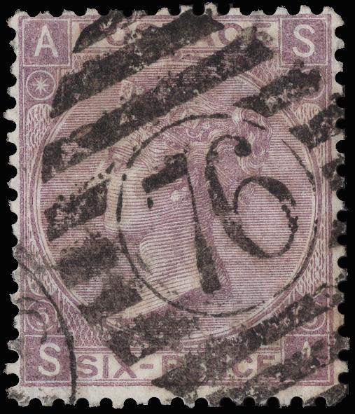 1865, Queen Victoria, 6d lilac, Emblems watermark (Scott 45), plate 5, bold New Cross "76" barred oval cancel, Fine to Very Fine. SG 97; £140 ($180). Scott $160. (Image)