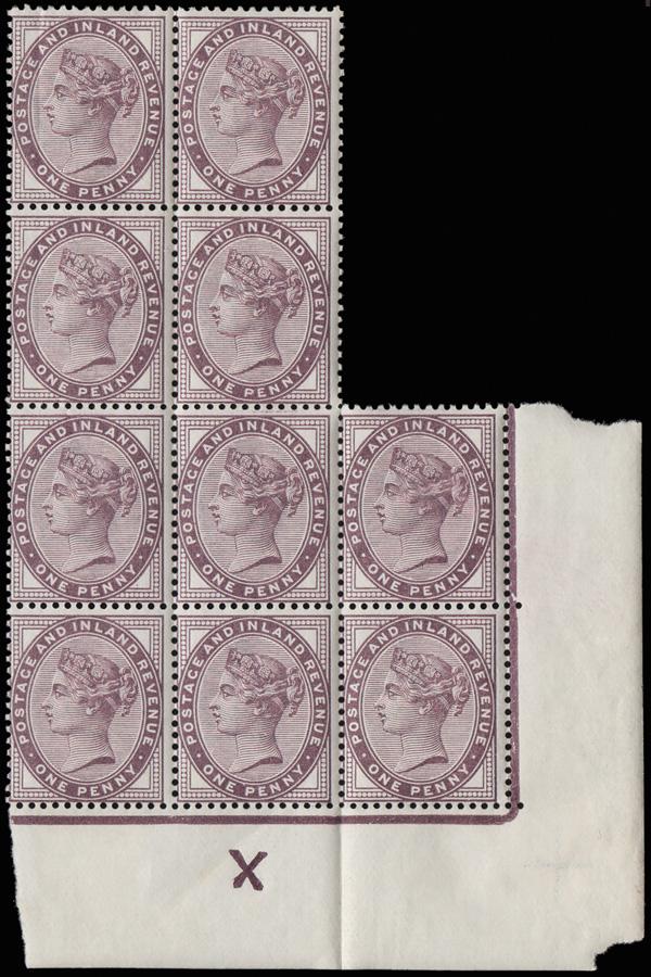 1881, Queen Victoria, 1d lilac, Die II (16 dots) (Scott 89), irregular control "X" block of 10 with imperf margins, o.g., stamps never hinged. SG 172; £28 as hinged singles ($40). Scott $33 as hinged singles. (Image)