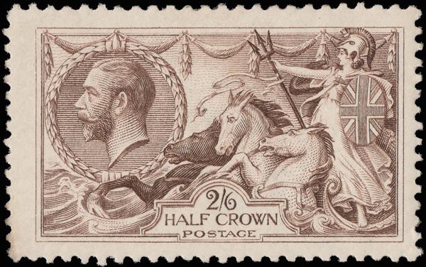1918, King George V "Seahorse", Bradbury, Wilkinson printing, 2s6d pale brown (Scott 179a), o.g., lightly hinged; tiny thin spot, Fine to Very Fine appearance. SG 415a; £175 ($230). Scott $160. (Image)