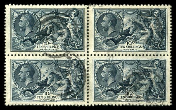1934, King George V re-engraved "Seahorse", 10s indigo (Scott 224), block of 4, Fine to Very Fine. SG 452. Scott $320. (Image)
