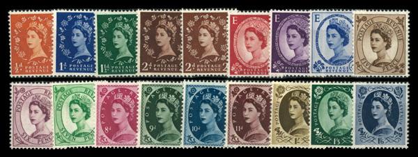 1955-58, Queen Elizabeth II (Wilding Portrait), ½d-1s6d complete (Scott 317-333), St. Edward's Crown watermark, complete set of singles, o.g., never hinged, Fine to Very Fine. SG 540/56. Scott $178. (Image)