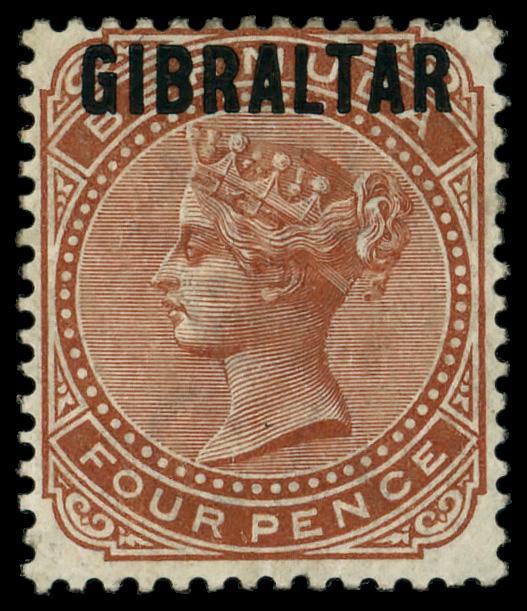 1886, "GIBRALTAR" on Bermuda (Queen Victoria), 4d orange brown (Scott 5), o.g., hinged, Very Good to Fine. SG 5. Scott $245. (Image)