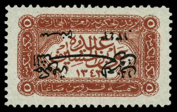 1925, Hejaz 5pi orange brown, Arab Government, inverted overprint (Scott 129a), o.g., lightly hinged, Extremely Fine. Scott $85. (Image)