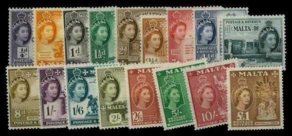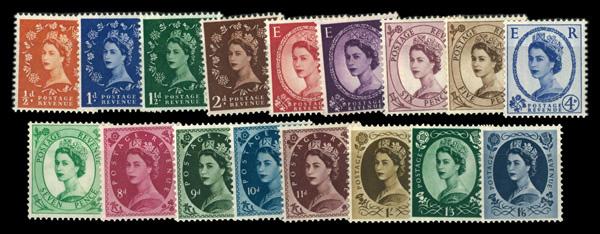 1952, Pictorials ½p green - £1 chocolate complete (Scott 121-136), complete set of singles, o.g., never hinged, Fine to Very Fine. Scott $160. (Image)