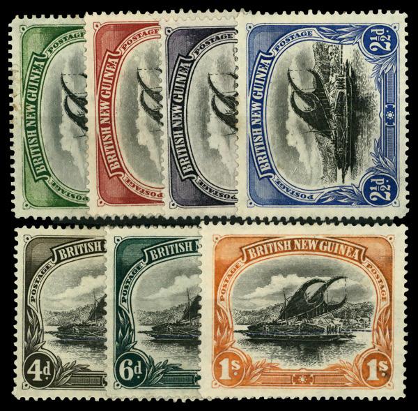 1901, Lakatoi ½d yellow green & black - 1sh orange & black (Scott 1-7), singles, o.g., hinged, Fine to Very Fine. Scott $266. (Image)