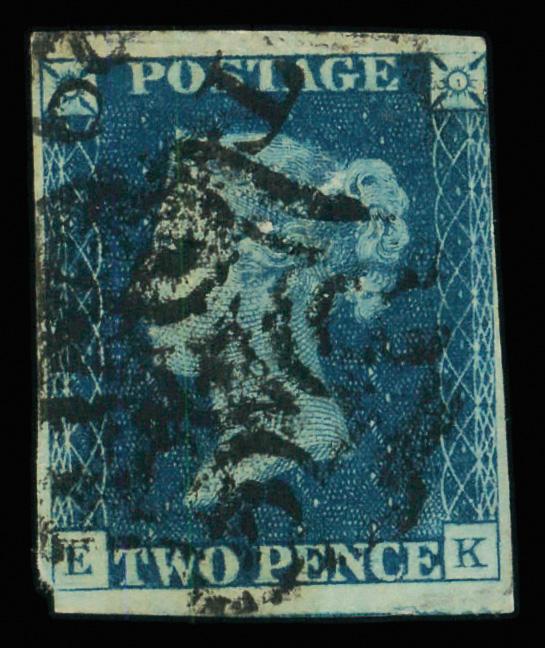 1840, Queen Victoria First Issue, 2d blue (Scott 2), black Maltese Cross cancel; thins, Very Good to Fine. SG 5. Scott $1,100. (Image)