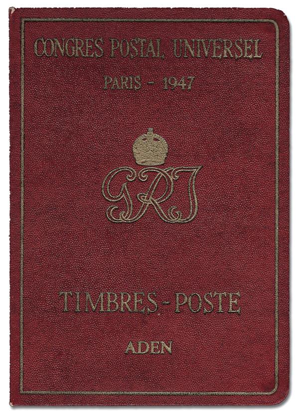 1947 U.P.U. Congress Presentation booklet, two-page heavy card folder in gold-embossed maroon faux-leather containing 50 mint, then-current stamps from Aden & States affixed to the pages, Very Fine. (Image)