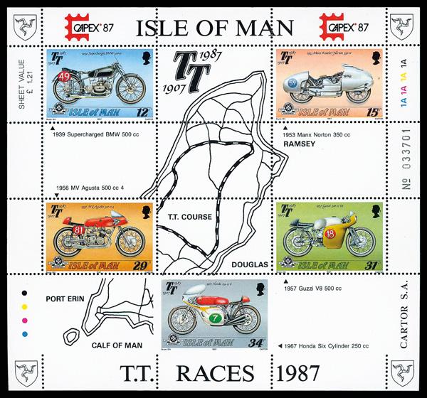 1987, 80th Anniversary Tourist Trophy Motorcycle Races, souvenir sheet (Scott 339a), horizontal misperf error, o.g., never hinged, Very Fine to Extremely Fine. (Image)