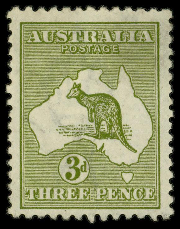 1915, Kangaroo and Map, 3d yellow olive, Die II (Scott 47a), 3rd watermark, single, o.g., hinged, Fine to Very Fine. SG 37d. Scott $190. (Image)