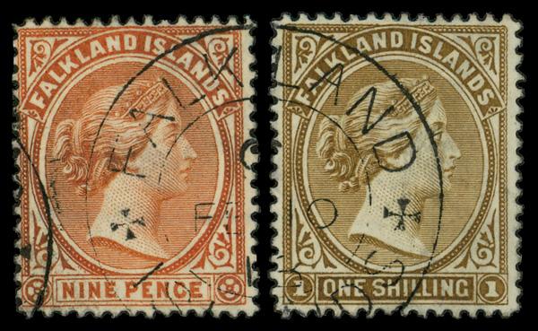 1891-1902, Queen Victoria 9p vermillion and 1sh gray brown (Scott 17-18), singles, Fine to Very Fine. Scott $125. (Image)