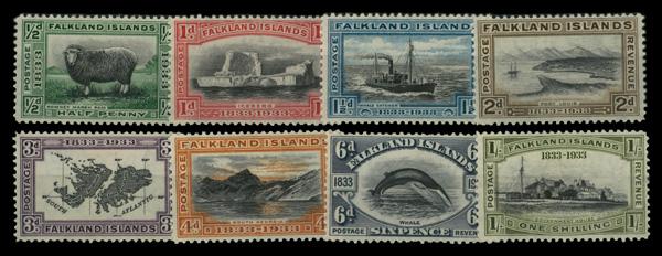 1933, Cent, of the permanent occupation of the islands as a British Colony (Scott 65-72), partial set of singles, o.g., hinged, Fine to Very Fine. Scott $250. (Image)