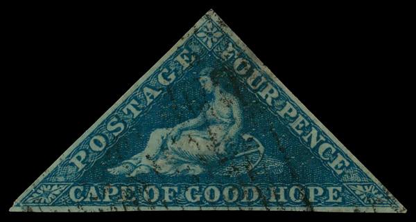1853, Triangular, Perkins Bacon printing, 4d deep blue on slightly blued paper (Scott 2), single, Fine to Very Fine. SG 4. Scott $170. (Image)