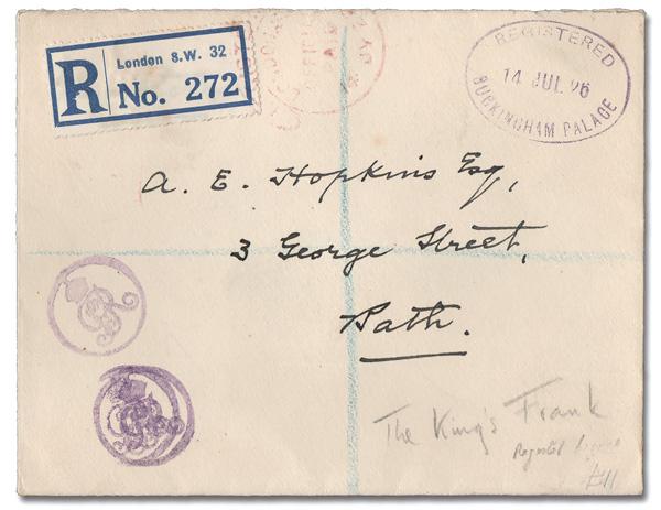 1926, King George V Free franked cover, handstamped purple Royal monogram on a Registered cover postmarked Buckingham Palace, Jul 14, 1926, with faint red London postmark the same day; an additional strike of the Palace oval, along with an intact red wax seal "B"; addressed to A.E. Hopkins in Bath, a founding member of the British Postal History Society., Very Fine. (Image)