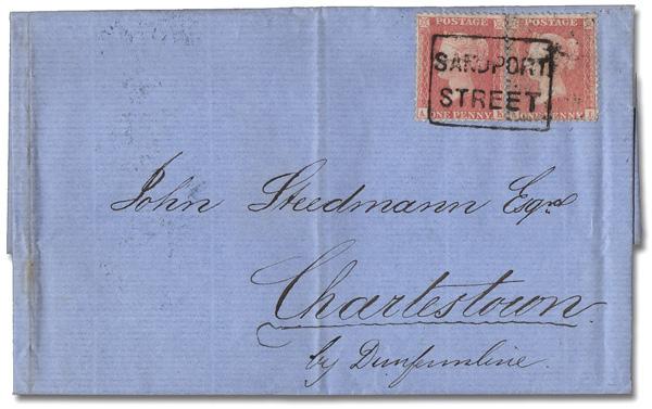 1857, 1d rose red, Large Crown watermark, perf 14 (Scott 20), horizontal pair, tied by a mostly complete boxed "SANDPORT/STREET" on a Scotish folded letter from Lieth to Charlestown by Dunfirmline; backstamped with clear Edinburgh and Dunfirmline c.d.s.s, both Aug 13, 1857, Very Fine. SG 40. Scott $195. (Image)