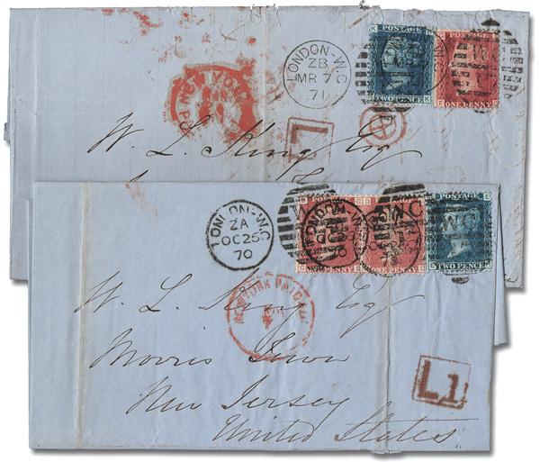 1857, 1d rose red & 2d blue, Large Crown watermark, perf 14 (Scott 20, 21), pair of covers from London to Morris Town, N.J., one franked with a a pair of 1d & a single 2d, the other with a single of each; stamps tied by London "W.C, 17" duplexes and both covers bear red New York PAID ALL c.d.s.s; dates are Oct 25-Nov 7, 1870, and Mar 7-24, 1871, respectively; each has a heavy vertical file fold,the first not affecting stamps, the second through one of the 1d stamps, otherwise Very Fine. SG 40, 35. (Image)