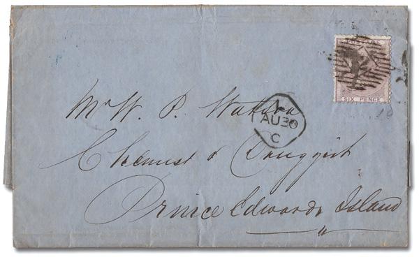 1856, Queen Victoria, 6d pale lilac, Emblems watermark (Scott 27), tied by a barred numeral "10" on a folded letter from London to Prince Edward Island, Aug 28, 1858; backstamped Prince Edward Island, Sep 24, Fine to Very Fine. SG 70; £250 ($330). Scott $275. (Image)