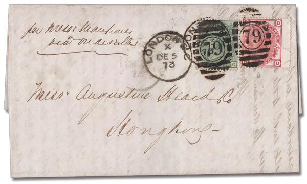 1873, Queen Victoria, 3d rose & 1s green, Spray of Rose watermark (Scott 61, 64), plate numbers 11 & 8, respectively, tied by London "79" duplexes, Dec 5, 1873, on a folded letter to Hong Kong, where it was backstamped on Jan 16, 1874; addressed to prominent American Tea & Opium merchants, Augustine Heard & Co.; endorsed "via Marseilles", Very Fine. SG 143, 150. (Image)