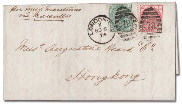 1873, Queen Victoria, 3d rose & 1s green, Spray of Rose watermark (Scott 61, 64), plate numbers 15 & 10, respectively, tied by London "78" duplexes, Nov 6, 1874, on a folded letter to Hong Kong, where it was backstamped on Dec 18; addressed to prominent American Tea & Opium merchants, Augustine Heard & Co.; endorsed "via Marseilles", Very Fine. SG 143, 150. (Image)