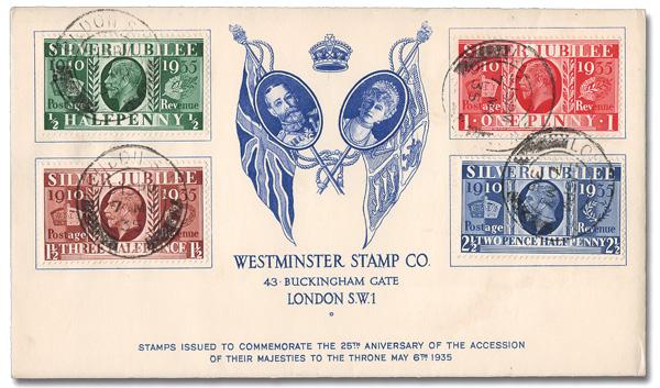 1935, King George V Silver Jubilee complete (Scott 226-229), on a gorgeous Westminster Stamp Co. cacheted First Day cover, Extremely Fine. SG 453/6. SG £650 ($870). (Image)
