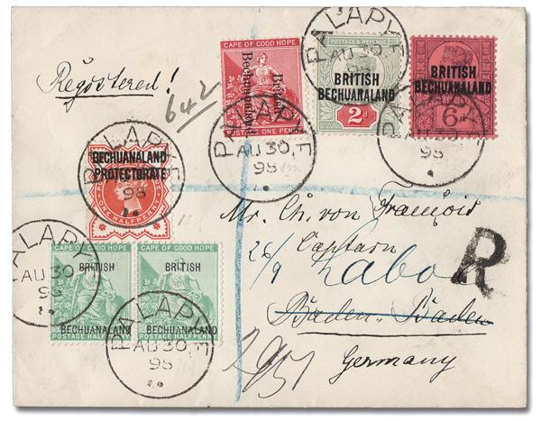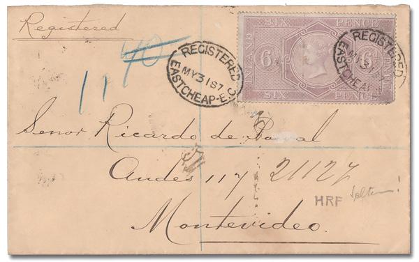 Postal-Fiscal, 1881, 6d reddish lilac (SG F27), tied by two strikes of a "Registered, Eastcheap-E.C., MY 31 87" oval on a cover to Montevideo, Uruguay, two different, somewhat blurry Montevideo backstamps; small mounting remnants on the reverse, Fine to Very Fine. SG £450 ($600). (Image)