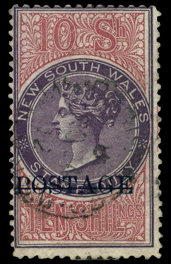 1894, 10sh rose & violet Queen Victoria Stamp Duty overprinted Postage in blue (Scott 76), single, Fine to Very Fine. Scott $60. (Image)