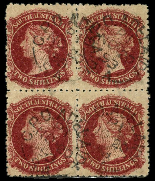 1869, Queen Victoria, 2s crimson carmine, perf 11½-12½ (Scott 53e), Large Star watermark, block of 4, Fine to Very Fine. SG 86. Scott $90. (Image)