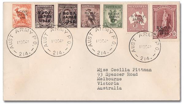 B.C.O.F., 1946-47, ½d to 5s complete (Scott M1-M7), tied by "AUST ARMY P. O./214, 13OC48" c.d.s.s on a cover to Melbourne. SG J1-7. Scott $279 off cover. (Image)