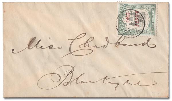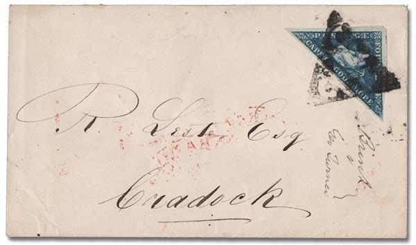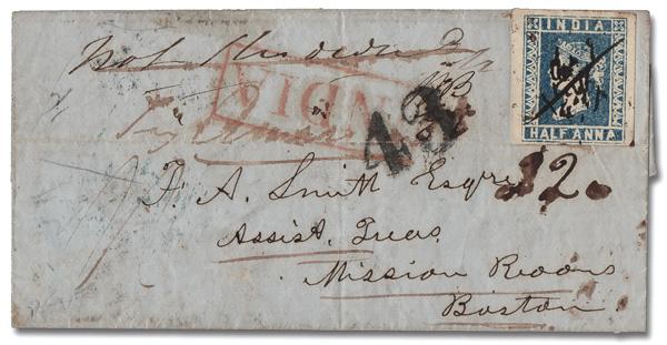 1854, Queen Victoria Lithographed, ½a blue, Die I (Scott 2 var.), four margins, pen canceled on a small folded letter datelined Tavoy (Burma), Feb 2, 1856, to Boston, Mass.; handstamped "43" and red boxed "INDIA" with five different backstamps, including a May 13. SG 2; £300 ($400). (Image)