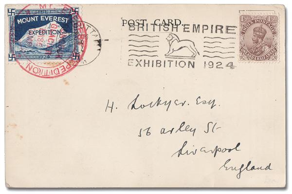 1924, Mount Everest Expedition, special postcard having blue label, red circular expedition cancel of Rongbuk Glacier Camp, and Oct 10 Calcutta British Empire Exhibition slogan cancel, Very Fine. (Image)