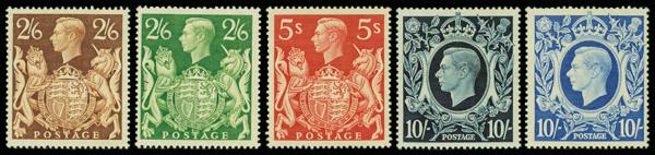 1939-42, King George VI "Square" high values, 2s6d to 10s (Scott 249-251A), complete set of singles, o.g., lightly hinged or hinge remnant, Very Fine. SG 476/8b. Scott $211. (Image)