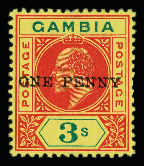 1906, King Edward VII, 1d on 3s carmine & green on yellow (Scott 66), single, o.g., lightly hinged, Very Fine. SG 70. Scott $60. (Image)