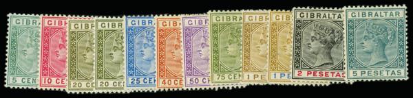 1889-96, Queen Victoria Spanish currency, 5c-5p complete (Scott 29-38), complete set of singles, o.g., lightly hinged, Fine to Very Fine. SG 22/33. Scott $294. (Image)