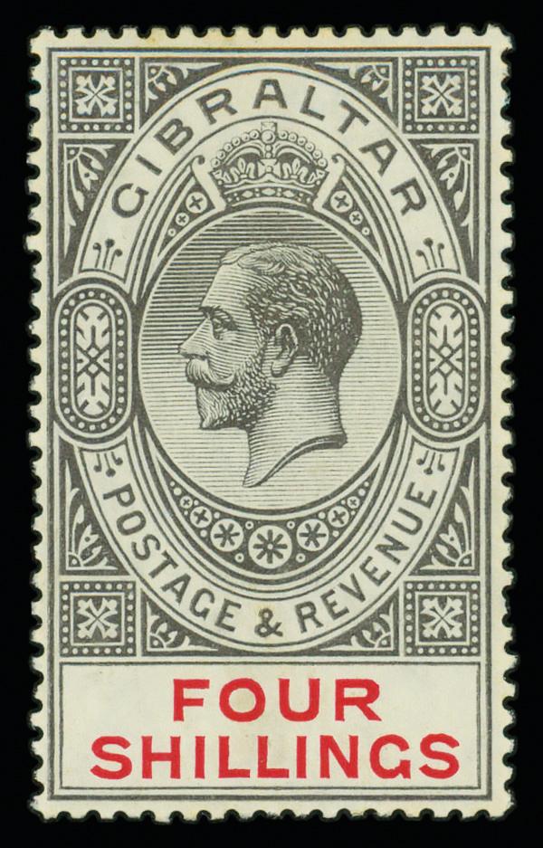 1912, King George V, 4s black & carmine, Multiple Crown CA watermark (Scott 73), single, o.g., hinge remnant, Fine to Very Fine. SG 83. Scott $40. (Image)