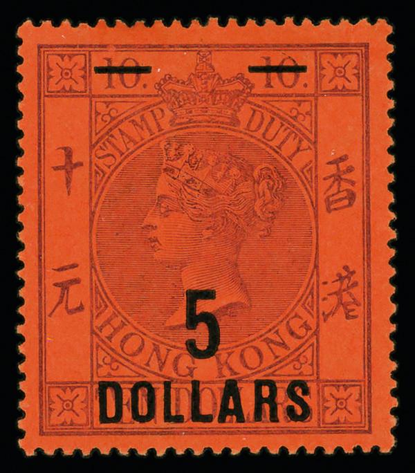 Postal-Fiscal, 1891, $5 on $10 purple on red (Scott 60), single, o.g., hinge remnant, Very Fine to Extremely Fine. SG F9. Yang F8. Scott $350. (Image)