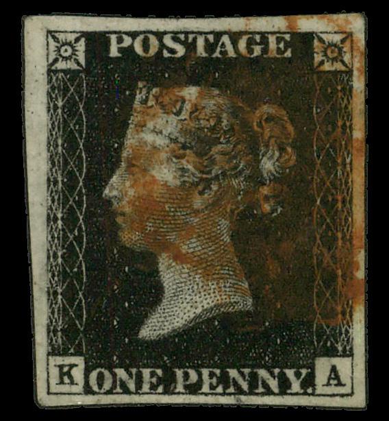 1840, Queen Victoria First Issue, 1d black (Scott 1), single, A 4 margin copy with red cancel position "K""A"., Fine to Very Fine. SG 2. Scott $375. (Image)