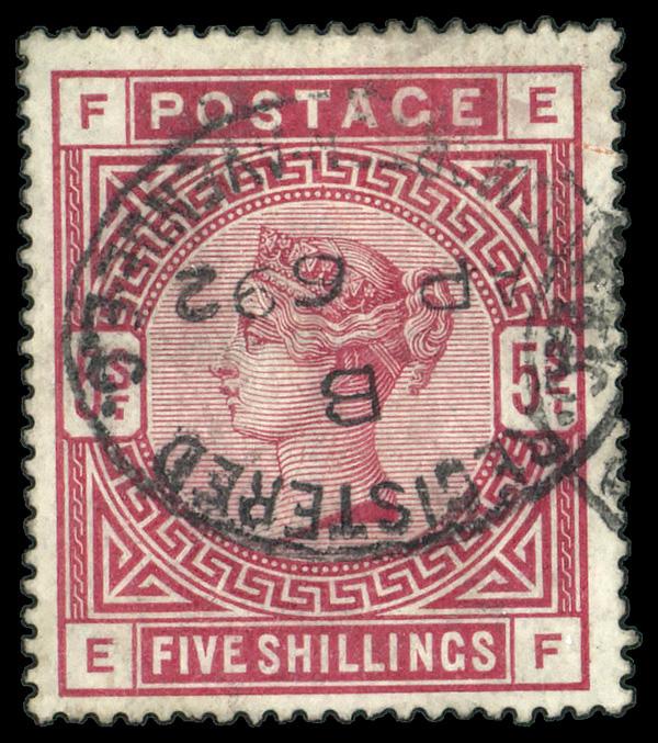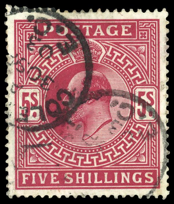 1902, King Edward VII, De La Rue printing, 5s bright carmine (Scott 140), single, Fine to Very Fine. SG 263. Scott $225. (Image)