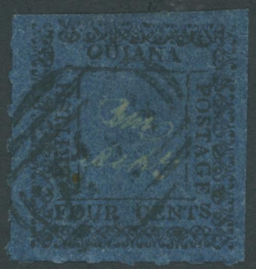 British Guiana. 1862 (Sept.) 4c. black on blue, signed in white in the centre, neat barred oval cancellation; fine. S.G. 122, £1,000 (Image1)