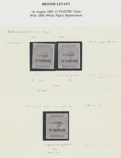 British Levant. 1885-88 12pi. on 2/6d. small study on album pages comprising examples overprinted "specimen" Type 9 on blued paper and Types 9 and 10 on white paper, four mint examples with different shades and printings; good to fine (Image1)