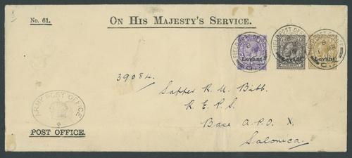 British Levant. British Field Office in Salonica. 1916 (1 Mar.) O.H.M.S. envelope bearing 3d. bluish violet, 9d. agate and 1/- bistre-brown, all tied to envelope by 'field post office/ g.x.' c.d.s., archival folds clear of the adhesives; very scarce stamps found on cover, especially the 9d. and 1/-. S.G. S4-S8 (Image1)