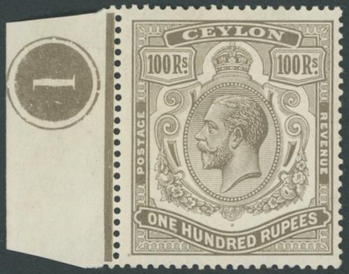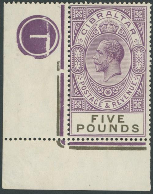 Gibraltar. 1925-32 Script £5 violet and black, lower-left plate number '1' example; large part original gum, very fine and scarce. S.G. 108, £1,600 (Image1)