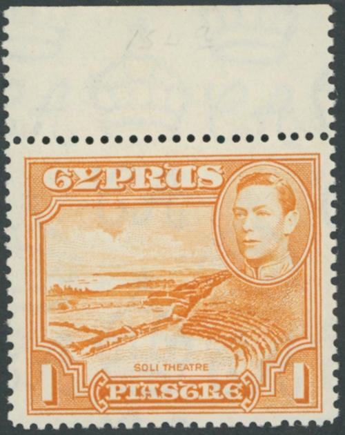 Cyprus. 1938-51 Script 1pi. orange, perf. 13½ x 12½, an unmounted mint example from the top of the sheet; very fine. S.G. 154a, £550 (Image1)