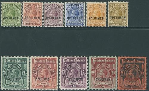 Falkland Islands. 1912-20 MCA set of eleven to £1, each overprinted "specimen", large part original gum, some with some natural gum wrinkles in places. S.G. 60s-69s, £1,900 (Image1)