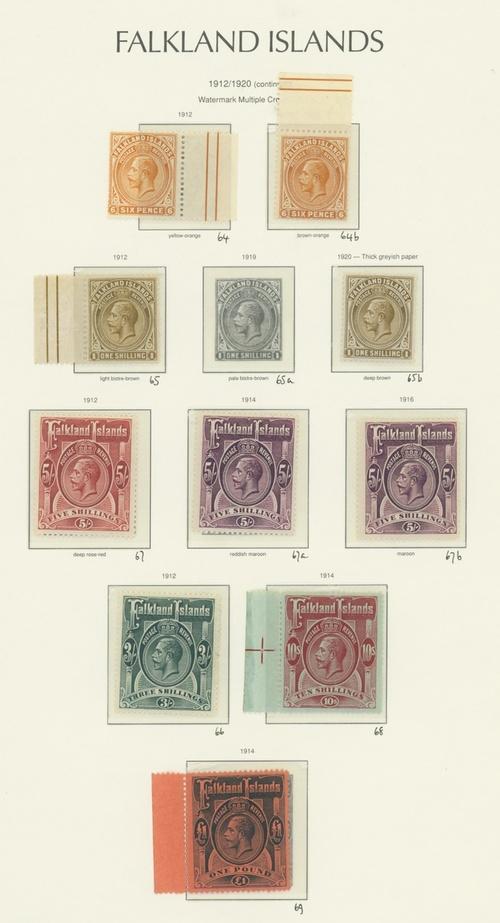 Falkland Islands. 1912-20 MCA mint group on two album pages (21) with a range of shades including all three 5/- values and the 10/- and £1 both marginal from the left of the sheet, almost all including the high values unmounted mint; fine. S.G. 60-69 group, £1,300+ (Image1)