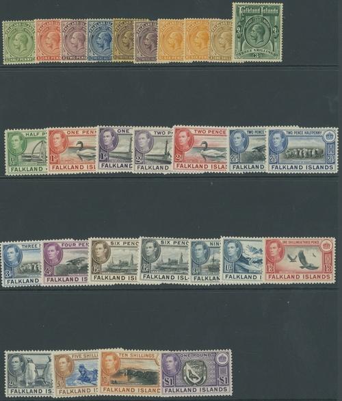Falkland Islands. 1921-52 group of mint sets comprising 1921-28 Script set to 3/-, 1938-50 Script set to £1, 1952 Script set to £1 and Dependencies 1944-45 sets for Graham Land, South Georgia, South Orkneys and South Shetlands; lightly mounted or unmounted mint. S.G. cat. value £890+ (Image1)