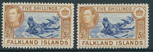 Falkland Islands. 1938-50 Script 5/- indigo and pale yellow-brown, two mint examples, both lightly mounted mint; fine. The first with Brandon (2002) and B.P.A. (2003) Certificates and the latter with Ceremuga (2016) Certificate. S.G. 161b, £2,200 (Image1)
