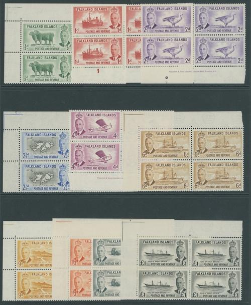 Falkland Islands. 1952 Script set of fourteen to £1, each value in an unmounted mint block of four; all marginal some with imprint of plate number, very fine. S.G. 172-185, £760+ (Image1)
