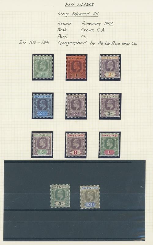 Fiji. 1903-27 mint group on album pages comprising 1903 CA set to £1 (£1 with a few minor tone spots), 1904-09 MCA set of three to 1/-, 1906 MCA set to £1, 1912-23 MCA part set to 2/6d. with shades including 3d. (4), 4d. (5), 1/- (5) and 2/6d. (4) 1912-23 War Stamps and 1922-27 Script set of fourteen to 5/-; good to fine. S.G. £1,100+ (Image1)