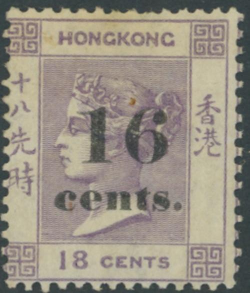 Hong Kong. 1876-77 16c. on 18c. lilac, a mint example, a few slightly nibbled perfs at top; large part original gum which is slightly toned; nevertheless an attractive example of this scarce stamp. S.G. 20, £2,500 (Image1)