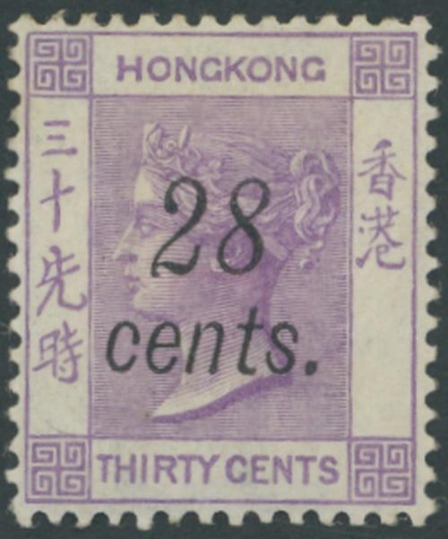 Hong Kong. 1876-77 28c. on 30c. mauve, part original gum; a couple of very faint foxing marks on the reverse not visible on the face; an attractive example. S.G. 21, £2,000 (Image1)