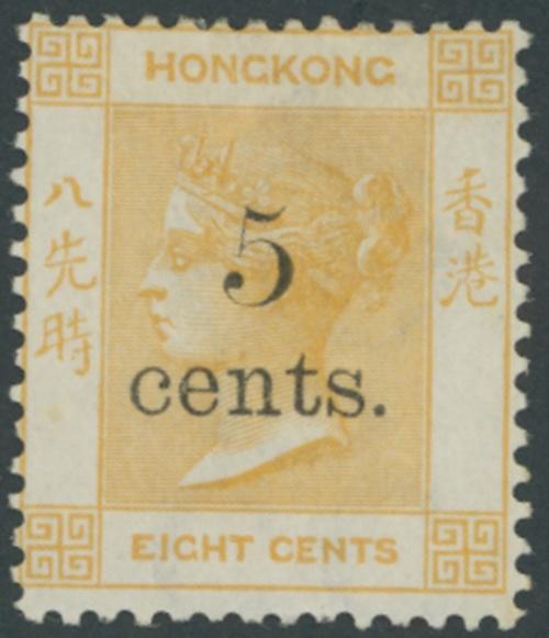 Hong Kong. 1880 (1 May-Sept.). 5c. on 8c. bright orange, faintly toned perf. at lower right corner; part original gum with hinge remainder at top, fresh appearance. S.G. 23, £1,500 (Image1)